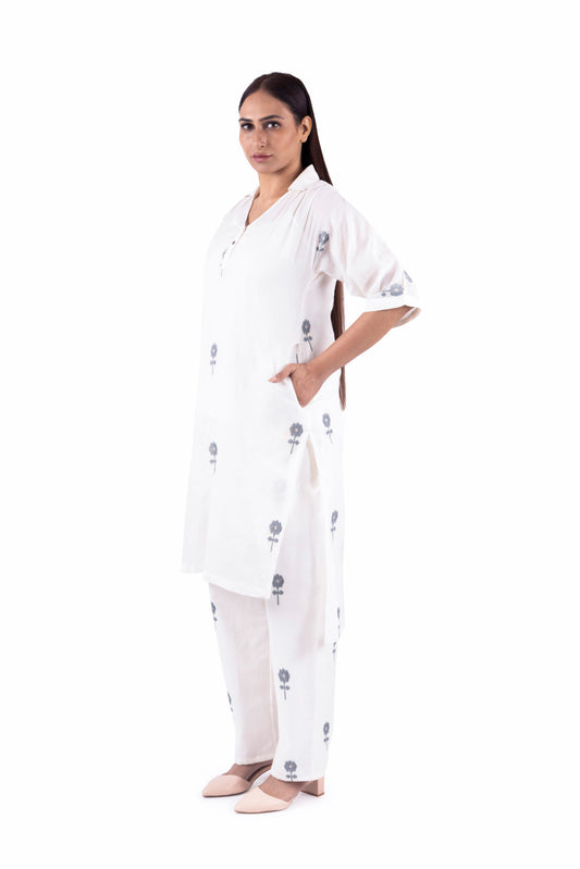 Bright White Navy Blue Flower Shirt Co-ord