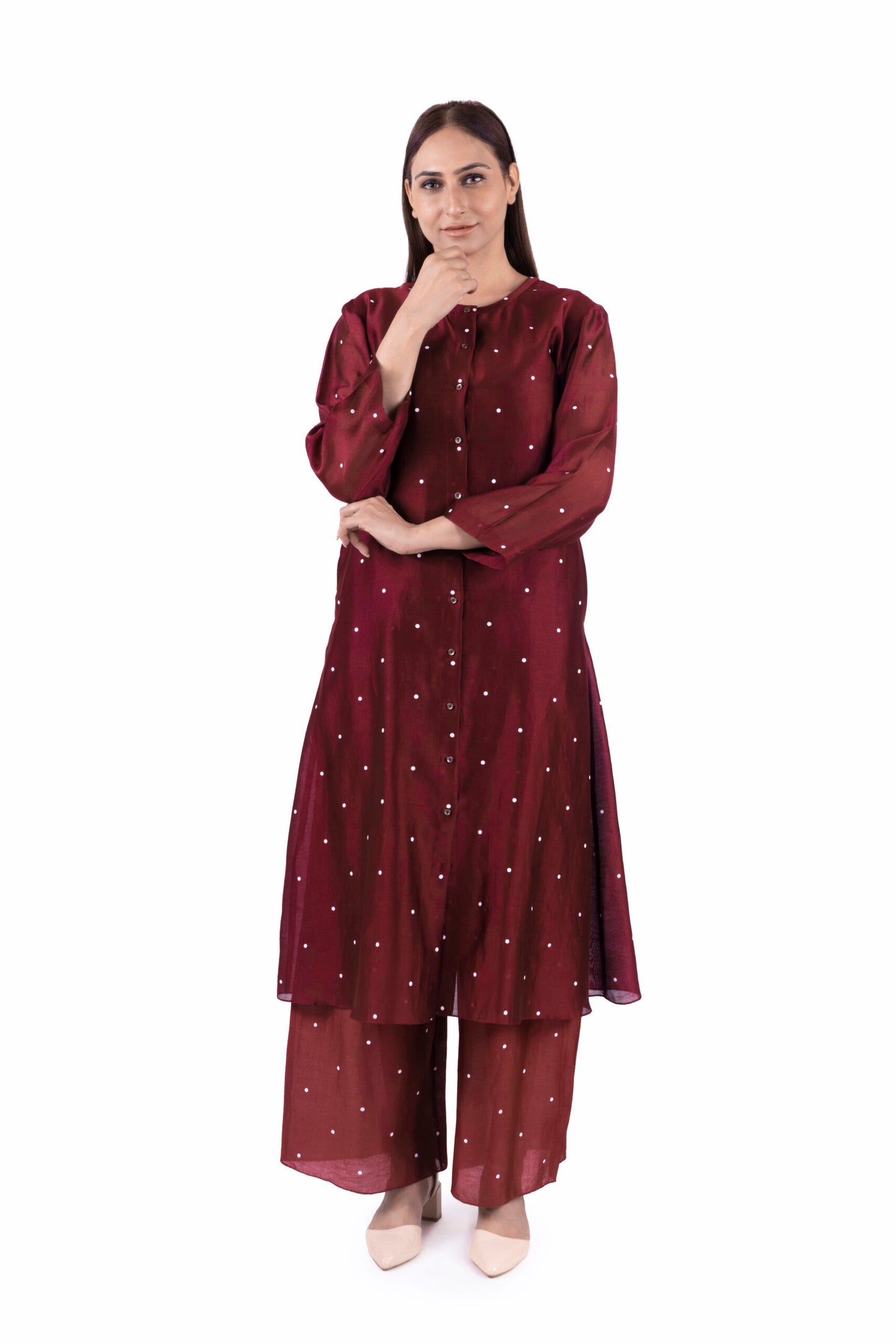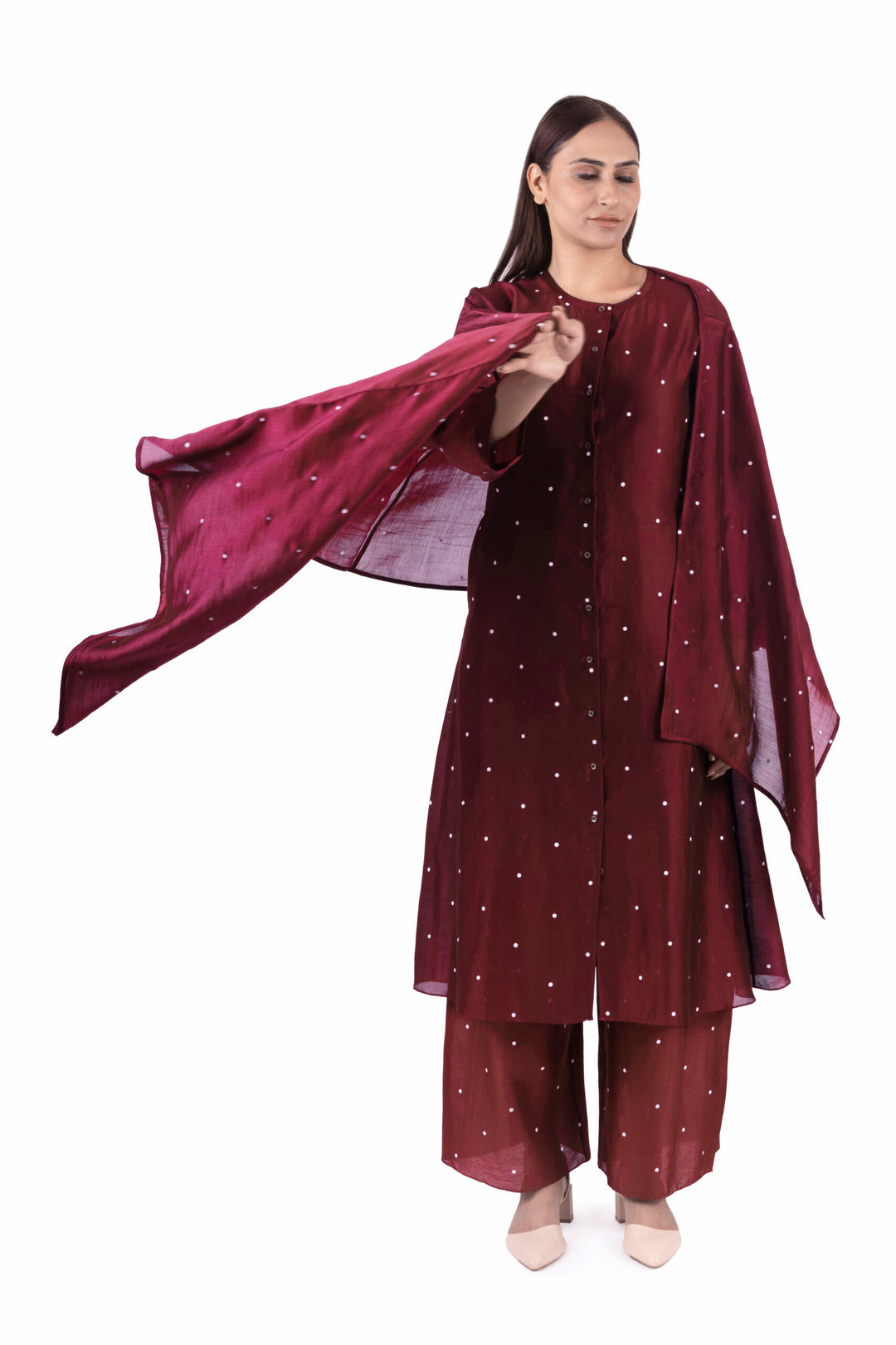 Crafted from luxurious Chanderi Silk, this set features a wine-colored dress with a full length of 48 inches. It comes with a regular fit, front opening, and stylish metal buttons. The set includes the dress, matching pants, and a scarf for a complete look.