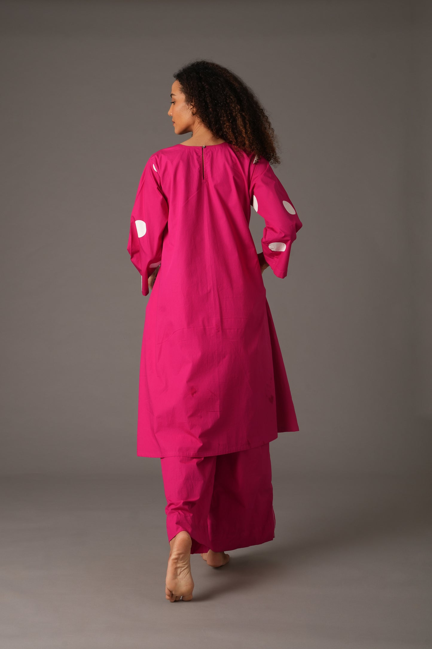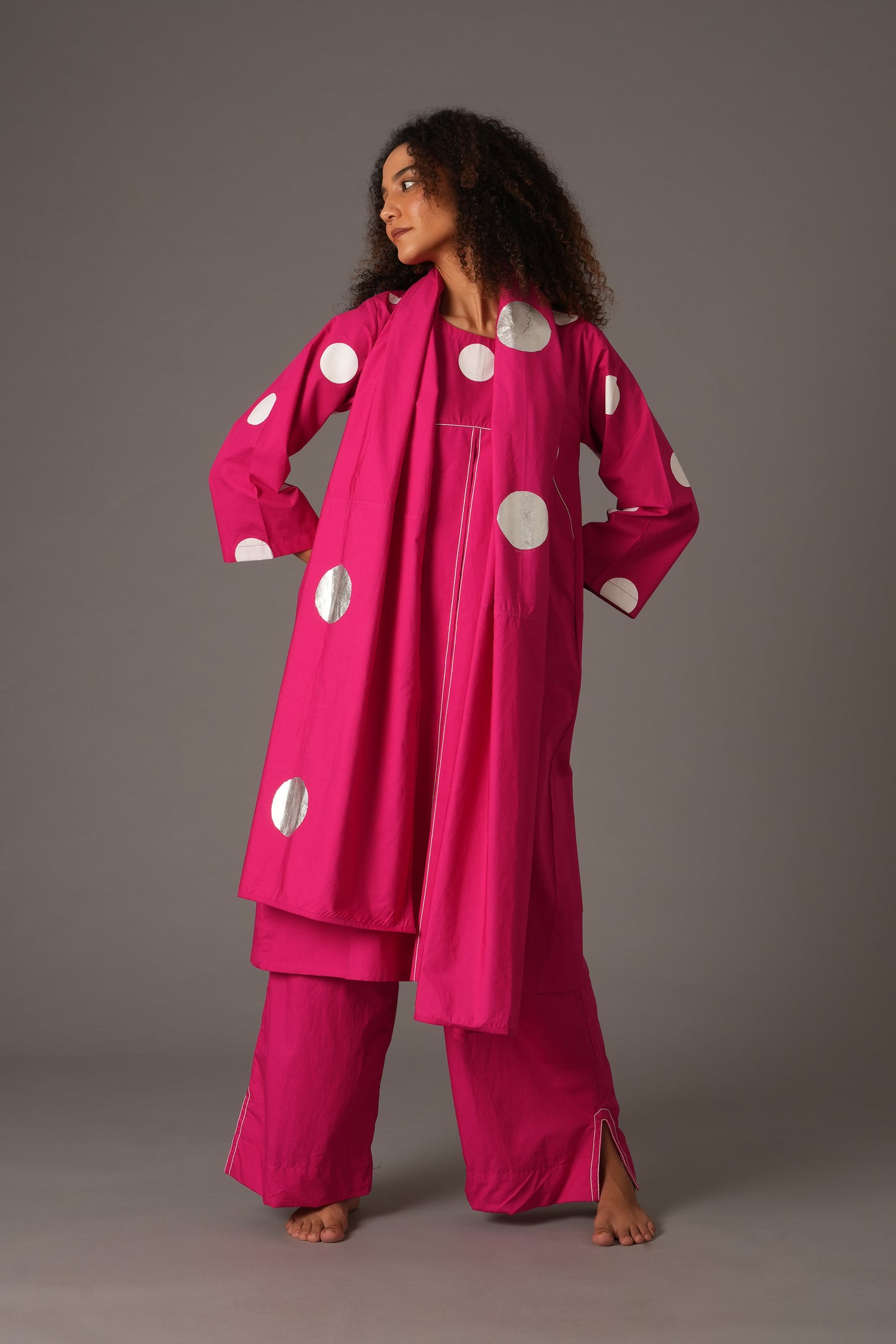 This beautiful Poplin Cotton set in Pink offers a perfect blend of comfort and style. It includes a dress, pant, and scarf. The dress, with a full length of 44 inches and 17-inch long sleeves, features a round neck and a unique 5-inch keyhole detail at the back. The box design in the front adds an elegant touch to the outfit, while the loose fit ensures maximum comfort. The accompanying scarf has a generous 82-inch length and a 25-inch width, designed with silver polka dots for a chic, modern look.