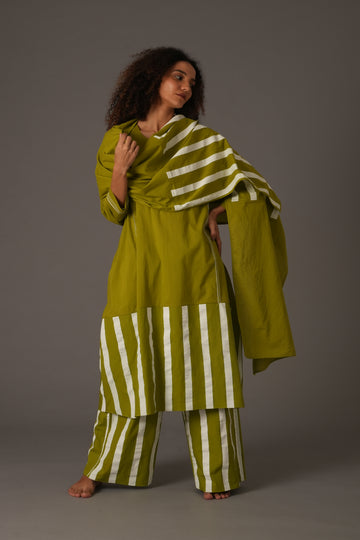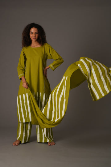 This Mul & Poplin set in a vibrant Purple features a 44-inch full-length dress, 38-inch pants, and an elegant scarf. The 19-inch long sleeves are accented with 1.25-inch stripes for a modern touch. The loose fit provides comfort and breathability, while the scarf (with a length of 82 inches and width of 25 inches) completes the chic look.